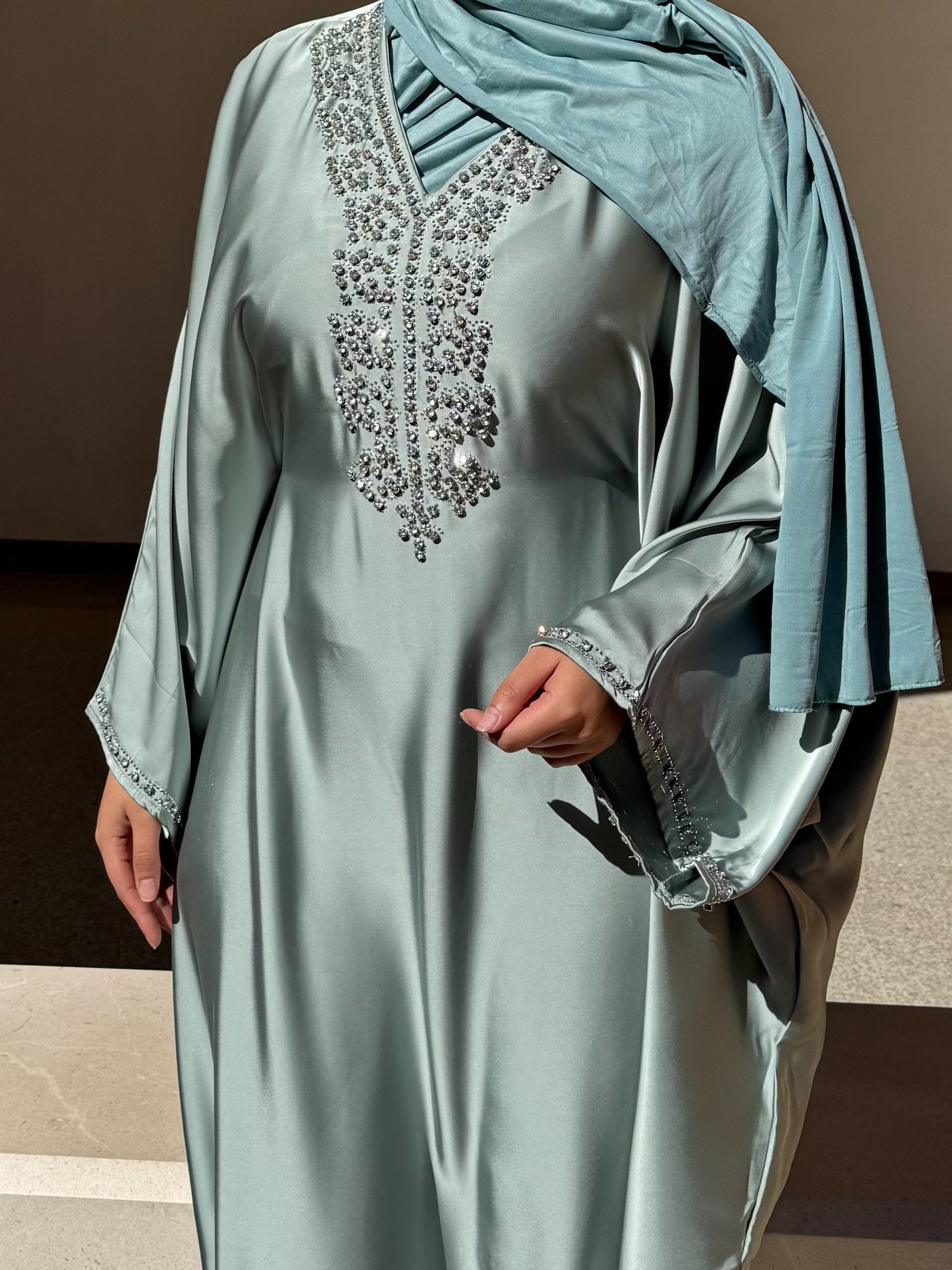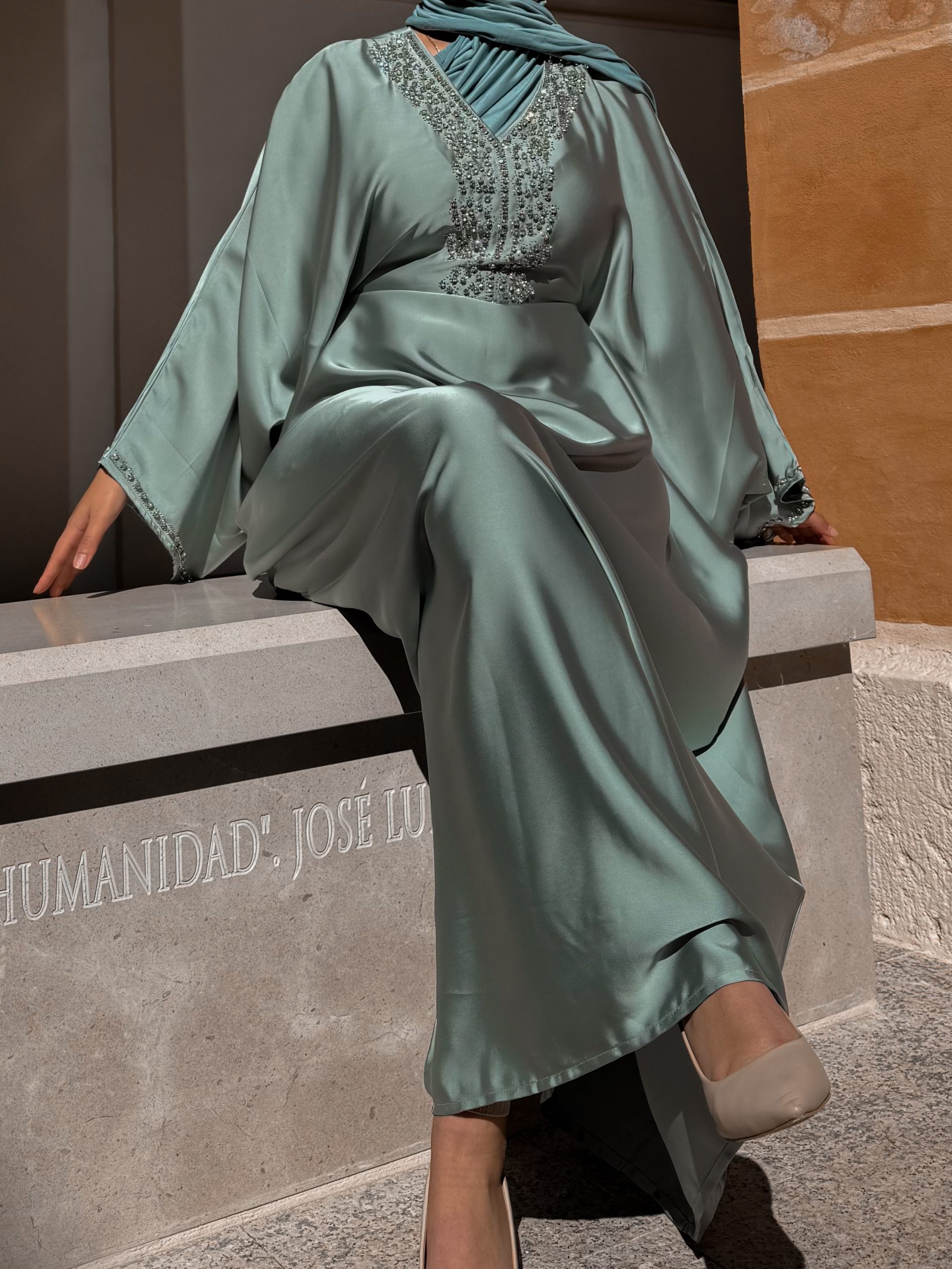 Descubre nuestra elegante abaya/farasha en color verde, una pieza sofisticada y fluida que estiliza la silueta. Se ajusta con un cinturón interior que permite adaptarla cómodamente al cuerpo, realzando la figura con discreción.