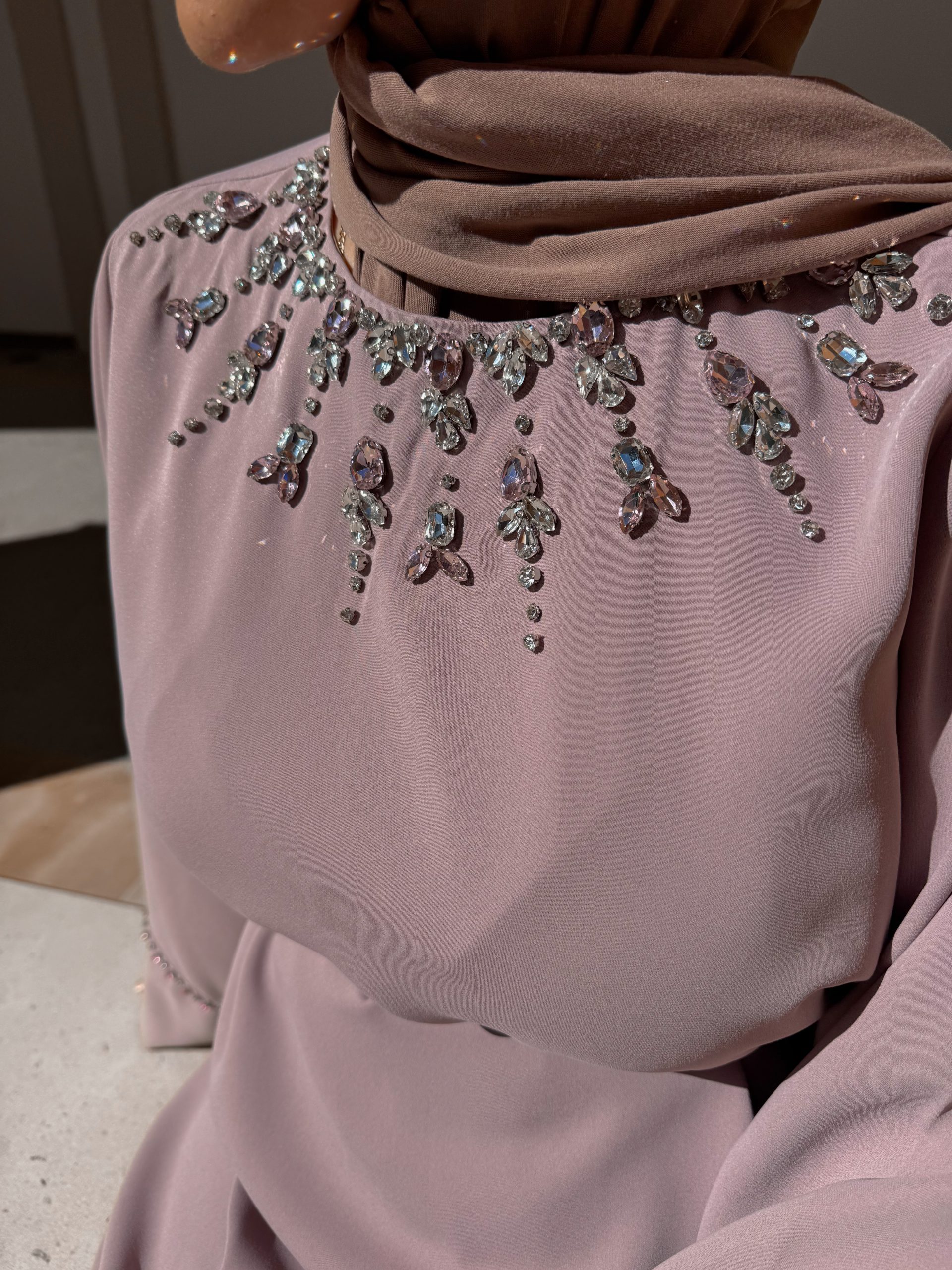 Vestido/abaya en color rosa con delicada pedrería en tonos rosa y plata, todas las piedras totalmente cosidas para mayor calidad y durabilidad. Incluye cinturón para ajustarlo y realzar la silueta. Disponible por tallas, es una opción elegante y perfecta para ocasiones especiales.